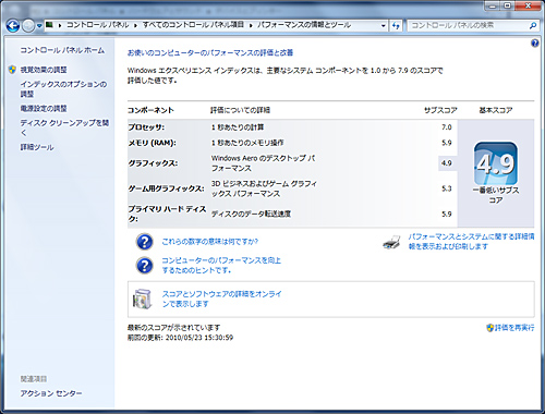 CPUはハイパワーなCore i5-650、メモリは4GB。32ビット版のOSは、メモリを約3GBしか利用できないので、4GBの大容量メモリを活用しきるためにも64ビット版を利用したい。HDDは1TBで、こちらも余裕のサイズ。Windows 7のベンチマークプログラムでチェックしたところ、基本スコアは4.9となった、CPUは7.0と高く、メモリとHDDも5.9と上々だ。グラフィックスがCPU内蔵の機能を利用しているので4.9と平均的。しかし、一般的な作業ならまったく問題のないレベルだ。