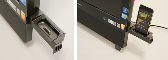 注目は、パソコンの電源がオフでも音楽が楽しめる「iPod Dock」を搭載していること。本体の右側面の下側にあるスライドを引き出すと、「iPod Dock」が現れる。iPodをつないで音楽を再生すると、音がパソコンのスピーカーから出力されるのだ。Universal Dockシステムを採用しており、アダプタを使ってさまざまなiPodを接続できる。ただし、ドックコネクタを搭載していない古いモデルと第3世代iPod、第2世代iPod touch、iPhoneには対応していない。