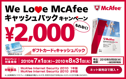 マカフィー(加藤孝博社長)は、キャッシュバックキャンペーン「We Love McAfee」を、7月1日から8月31日まで行う。「マカフィー インターネットセキュリティ 2010」のパッケージ製品の1年版か2年版購入者を対象に、2000円分のVISAギフトカードをプレゼントする。ダウンロード製品やライセンス製品は対象外。