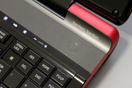 スピーカーは、harman/kardon社と東芝が共同開発したステレオスピーカーを搭載する。ウーファーがないので低音の迫力には欠けるが、ノートパソコンとしてはトップクラスの音質で、ワイドレンジで高音質を楽しめる。サウンドに広がりをもたせる「ドルビーアドバンスオーディオ」や、登場人物の台詞の音声だけを聞きやすくする「MaxxAudio」などに対応するのもポイント。さらに、iPodなどの携帯オーディオを音声入力端子につなげば、スピーカーから再生できる。パソコンの電源が落ちていてもOKだ。iPodとは比べものにならない高音質で音楽が楽しめる。