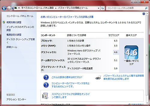 CPUはCore i5-450Mで、メモリは4GBを搭載。OSはWindows 7 Home Premiumだが、64ビットと32ビットを選べるセレクタブルOSとなっている。Windows 7のベンチマークスコアをチェックしたところ、グラフィックスは4.6と標準的なスコアだったが、ハイビジョン映像の再生には問題ない。