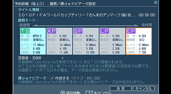 録画番組の画質は、高画質のTSモードから長時間モードのEPモードまで、5段階の設定を用意している。2層書き込み対応のBDなら、LPモードで18時間記録できるので、ドラマなどの1クール(12話分)が1枚に収まる。SpursEngineのおかげで、変換処理が負担にならないので、気軽に利用できる。もちろんダビング10に対応しており、録画番組はDVDやBDメディアに書き出せる。