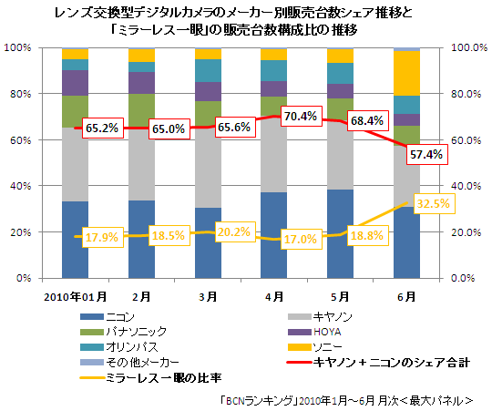 「BCNランキング」によると、従来のデジタル一眼レフカメラとミラーレス一眼を合算した「レンズ交換型デジタルカメラ(デジタル一眼カメラ)」の2010年上半期のメーカー別販売台数1位は、エントリー向けからプロ向けまで幅広く展開するニコンが獲得。2009年の年間1位だったキヤノンは2位に後退した。シェアはニコンが34.0%、キヤノンが31.4%。わずか2.6ポイント差だった。
