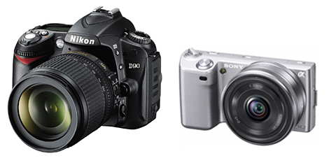 ニコンのデジタル一眼レフカメラ「D90」(左)と、ソニーのミラーレス一眼「NEX-5」(右)