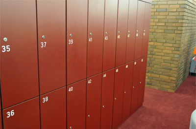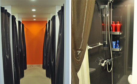 赤やブラウンなど、暖かい色を基調にしたパウダールームやロッカールームは、広々としたスペースを確保。シャワールームは、オレンジの壁やふわふわしたダークシルバーのシャワーカーテンで、まるで高級スパのような贅沢な雰囲気だ。これに対して男性更衣室は、どうみても機能一辺倒で……。