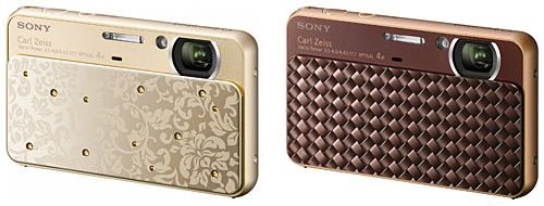 「DSC-T99D」は、「DSC-T99」をベースに特別なデザインを施したモデル。光沢感のある「ゴールド」は、ラインストーンを前面にちりばめたレンズカバーに植物をモチーフとした華やかなパターンのデザインを採用。「ブラウン」は、革製のバッグや手帳の編み込みをイメージさせるデザインを採用し、深みのあるブラウンのボディとサイドのオレンジゴールドの組み合わせでファッション性を高めた。
