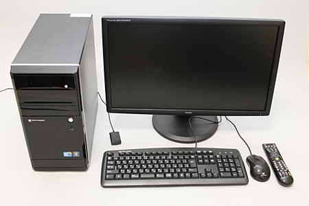 パソコン本体はミニタワー型で、カラーはブラック。前面は光沢感のある塗装を施し、精悍な印象だ。電源とHDDアクセスのLEDは、ブルーとパープルで明るい。ケースの最下段を押すとカバーが開き、2つのUSB端子と音声入出力端子が現れる。左側面には排気口があるので、パソコン本体はディスプレイの左側に置いたほうが、操作中の排気がよけられる。付属のキーボードはPS/2、マウスはUSBで接続するタイプ。キーボードはテンキー付きの標準的な109キーボードだ。なお、テレビリモコンの受信部は、USBで接続しておく必要がある。