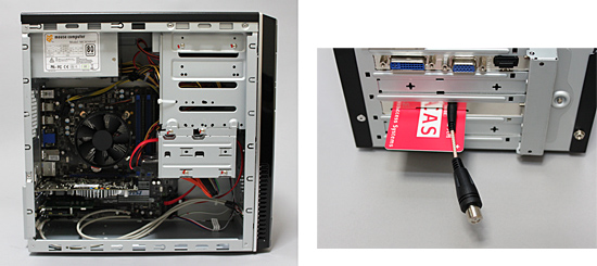 ミニタワー型の本体内部。背面にB-CASカードスロットとアンテナ変換アダプタを備える