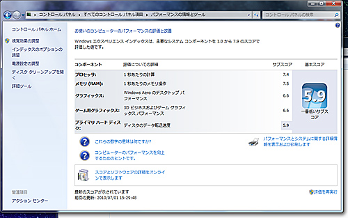 Windows 7のベンチマークスコアは、グラフィックスとゲーム用グラフィックスが、ともに6.6と性能は高く、動画再生はもちろんのこと、最新の3Dゲームも快適に動作する。HDDは標準的だが、その他のスペックが高いので、地デジをウィンドウ表示して、他の作業をしながら見ることも余裕でできる。BDのフルHDビデオを再生していてもCPU使用率は5%という低さ。大容量データの操作でのストレスは感じない。