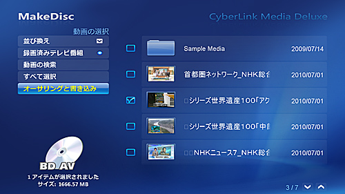 電子番組表は一覧性が低いのでやや使いにくいが、録画予約をする場合はドラマや映画などのジャンルを指定し、検索結果から選ぶと簡単。また、シリーズ予約も手軽にできる。録画した番組は、「CyberLink Media Deluxe」を利用してBDに書き出す。