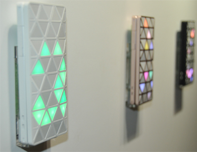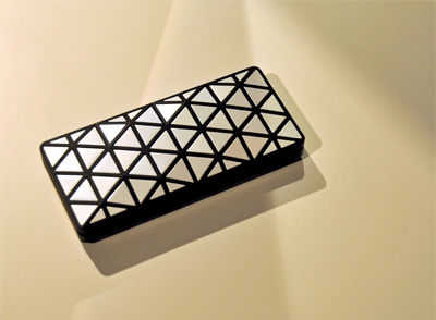 「LIGHT POOL」は、プロダクトデザイナーの坪井浩尚氏がデザインを手がけた。トラス状の表面に三角形の“窓”を採用し、22個の高輝度LEDによって、電話やメール着信、ボディの開閉などのときに、100パターンの光で表面を彩る。カラーはホワイト、ピンク、ブラックの3色。