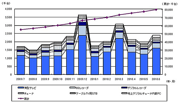 地上デジタル放送受信機器全体の合計は241万2000台。累計では8000万台を超え、8012万3000台となった。