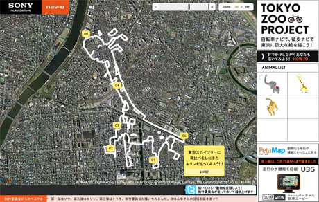 ソニーは、7月22日、ポータブルナビ「NV-U35」の販促キャンペーンとして、自転車や徒歩の軌跡を描く「走行ログ」機能でインターネットの地図上に動物の地上絵を描く「“nav-u”presents ナビで地上絵――TOKYO ZOO PROJECT」を開始した。期間は8月31日まで。