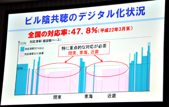 一方で、ビル陰の共聴施設整備や、集合住宅のデジタル化対応が遅れていることを課題に挙げた。特にビル陰の共聴施設は、2010年3月末の時点で全国の47.8%としか対応しておらず、なかでも関東、東海、近畿では、重点的な対応が必要だとした。
