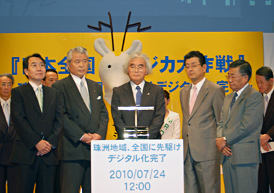 総務省と全国地上デジタル放送推進協議会、社団法人デジタル放送推進協会(Dpa)は、地上デジタル放送への完全移行まで残り1年となった7月24日、地デジ推進メインキャラクターの草なぎ剛さんらを司会に迎え、「日本全国 地デジカ大作戦~地上・BS完全デジタル移行まったなし1年前の集い~」を都内で開催した。また「アナログ放送終了リハーサル実施地域」として、この日、全国に先駆けてアナログ地上波放送を終了した石川県珠洲市でも、「全国に先駆けデジタル化完了」記念セレモニーが催された。