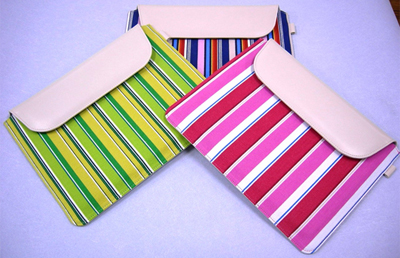 先染糸を使ったストライプの帆布と人工皮革のクラリーノで、独特なデザインを実現した。帆布は、スピリットブルー、シュガリーピンク、エコグリーンの3色。本体サイズは、縦21.5×横27.5×厚さ1cm。