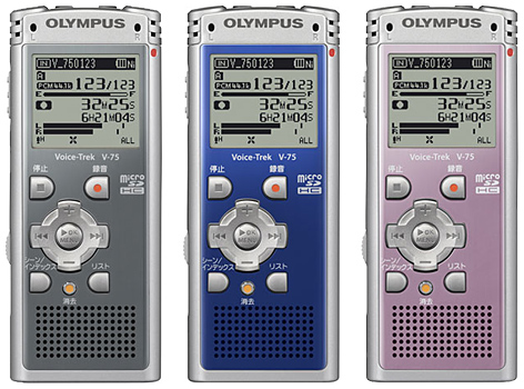 「V-75」は、容量4GBの内蔵メモリに加え、microSDカードに対応。「V-85」同様、音声フォーマットWAV、MP3、WMAの録音・再生ができる。カラーはグレー、ブルー、ピンク。また「V-65」は容量2GBの内蔵メモリだけで、カードスロットは非搭載。音声フォーマットはMP3とWMAで、録音・再生に対応する。カラーはライトシルバー。