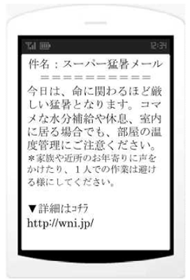 携帯電話専用のメール配信サービスで、月額315円の有料携帯サイト「ウェザーニュース」(http://wni.jp/)に会員登録している人なら誰でも利用できる。メールでは、気象のプロが熱中症に関するアドバイスを提供。また、メール本文のURLをクリックすることで、さらに細かい情報を確認することができる。
