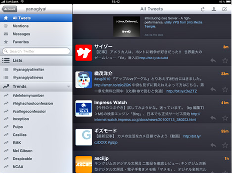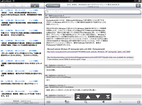 つい最近、iPadにも大規模掲示板「2ちゃんねる」の専用ビューワー「2tch」が公開された。「2tch」は、ブックマークや履歴、検索機能などを搭載し、お気に入りのスレッドを巡回できる。インターフェースはシンプルだが、書き込みが急増しているスレッドをチェックする機能もある。ウェブページよりも、格段に見やすい。