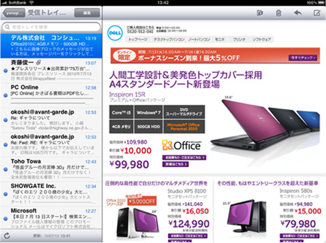 メールアプリは、iPadを横向きにすれば、分割した画面に、開いたメールの本文と受信ボックスにあるメッセージの両方、さらに、各メッセージの2行のプレビューを表示する。受信件数が多くてもサクサク処理できる。POPはもちろん、IMAPにも対応している。ただし、iPhone 4のように複数アカウントのメールをまとめて扱うことはできない。