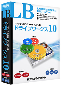 「LB ドライブワークス10」は、パーティション操作、ハードディスクのバックアップのコピー、抹消の四つの機能を収録したユーティリティソフトで、ライフボートのシステムユーティリティソフトの最上位版。