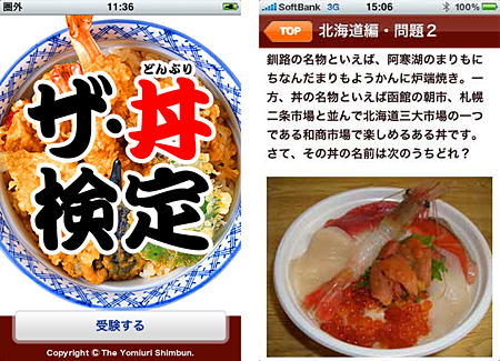 読売新聞東京本社は、グルメ度をチェックできるiPhoneアプリ「ザ・丼検定」を7月27日に公開した。カテゴリはゲームで、価格は230円。8月26日までは半額の115円で販売する。