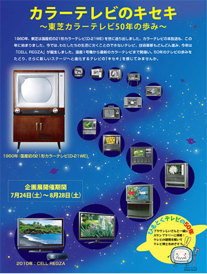 1960年に発売した国産初の21型カラーテレビ「D-21WE」から、最新の「CELL REGZA」まで、東芝のカラーテレビの歴史や技術を紹介。テレビにちなんだクイズを解いてテレビ博士を目指すスタンプラリーも開催している。