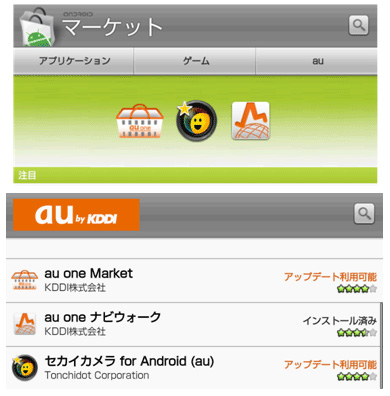 ユーザーは「Android マーケット」のトップページにある独自の「auタブ」から、「au one Market」や「au one ナビウォーク」など、auオススメのアプリを簡単に探すことができる。