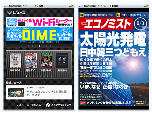 iPad向けサービス同様、Wi-Fiネットワーク経由のみで利用できる。料金は30日間で350円で、Wi-Fi経由で初めて「ビューン」を利用した日から30日間は無料。対応機種は、iOS3.1以降を搭載したiPhone/iPod touch。