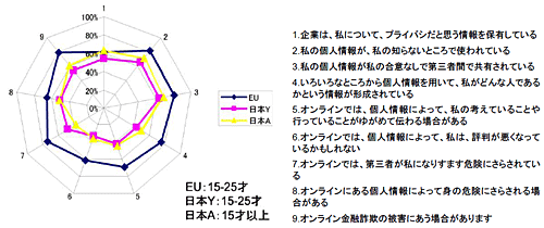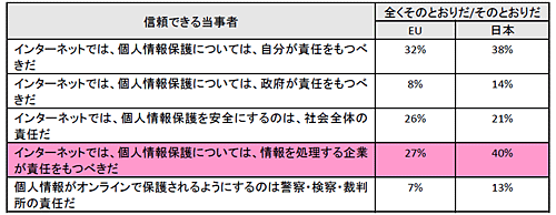 また、日本のユーザーは、プライバシーの侵害を防ぐ責任は、利用者本人よりもサービス事業者にあると思っている。これはEUと逆の結果で、日本のユーザーはプライバシー侵害を自分で防ぐという意識が低い。