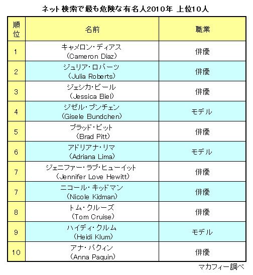 マカフィーは、8月19日、2010年の「インターネット検索で最も危険な有名人」は、俳優のキャメロン・ディアスだと発表した。