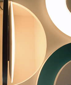 最厚部43mm、最薄部8mmのLEDシーリングライト。広範囲な配光と均一面発光によって天井になじみ、部屋が広く感じられるという。