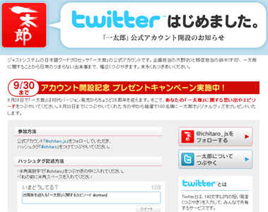 9月30日までに、一太郎の関する思い出やエピソードをつぶやいた人の中から抽選で100名に一太郎オリジナルグッズをプレゼントするキャンペーンを実施している。