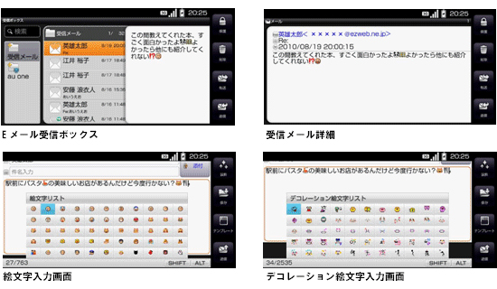 このメールアプリケーションを利用すれば、従来のau携帯電話から機種変更しても同じメールアドレスを使い続けることができ、絵文字やデコレーションメールなどが楽しめる。