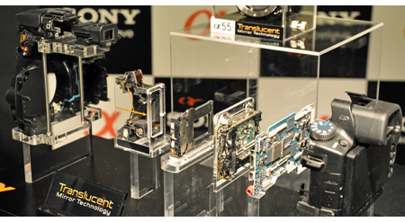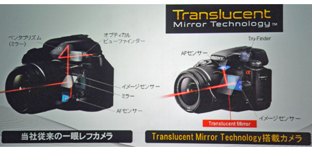 デジタル一眼カメラの一般的なミラーの代わりに、光を通すミラーを用いたことで、常にAFセンサとイメージセンサに光を同時に当てる「Translucent Mirror Technology」を搭載。シャッターを切った時のミラー部分のアップダウンがなくなることで、1秒間に最高10コマの高速連写を実現した。静止画でも動画でも、TTL位相差検出方式AFで瞬時に被写体を捉え、ピントを合わせる。