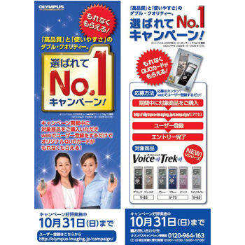 オリンパスのICレコーダー「Voice-Trek V-85」「Voice-Trek V-75」「Voice-Trek V-65」を購入したあと、ウェブサイトでユーザー登録をしたユーザーにQUOカードをプレゼントする。キャンペーンの専用ページから申し込む。