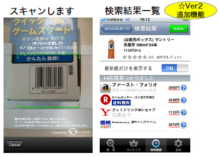 「ショッピッ!」は、商品のバーコードにiPhoneのカメラをかざし、バーコードを読み取って、ECサイトから最安値で買うことができるアプリ。