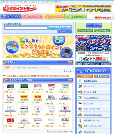ビックカメラは、9月1日、NTTナビスペースと共同で、雑貨、書籍、ファッション、グルメ、サービスなど、多くの国内ECショップの商材を取り扱うインターネットショッピングモール「ビックポイントモール」を開設した。