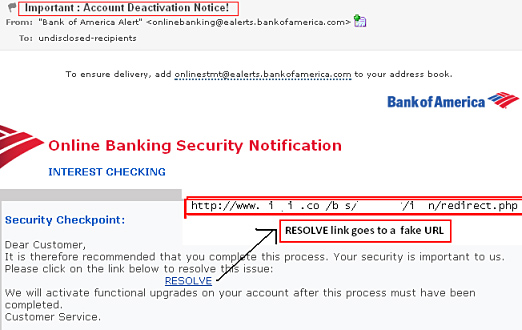 「バンクオブアメリカ」の最近の攻撃は、「オンラインバンキングのセキュリティ規制により、利用者は提示されたURLをクリックする必要がある」と、口座の失効を警告するスパムメールが届く。「RESOLVE」というリンクをクリックすると、悪質なサイトにリダイレクトされるという。また、「ペイパル」のアカウントの詐欺は、正規ページと同じ画像、スタイルシート、リンクが使用された偽のページにリダイレクトされる。