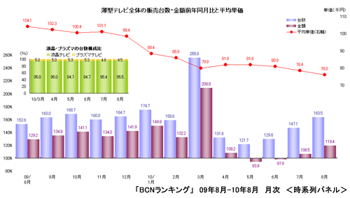 液晶テレビとプラズマテレビを合算した薄型テレビ市場は、家電エコポイント制度の特需で盛り上がりをみせた2010年3月以降はやや落ち着き、8月の対前年同月比は販売台数163.5%、販売金額119.4%だった。また、平均単価(税別、以下同)の下落が顕著で、1年前の09年8月は10万4000円程度だったが、10年8月には7万6000円と3万円近く下がっている。