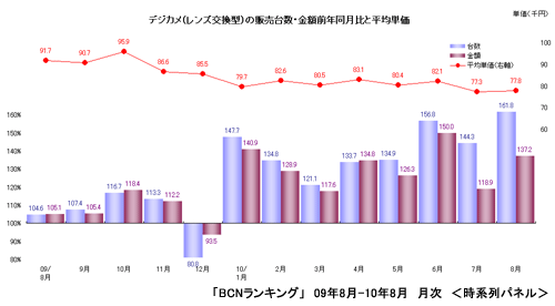デジタルカメラ市場は、販売台数は堅調な成長をみせているが、薄型テレビ同様、平均単価の下落が目立つ。8月の対前年同月比は、販売台数114.8%、販売金額102.6%だった。平均単価は、1年前の09年8月で2万8000円程度だったが、10年8月は2万5000円程度に。レンズ一体型(コンパクトデジタルカメラ)の単価が下がり続けているのが原因だ。