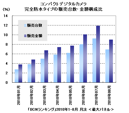 防水仕様のコンパクトデジタルカメラは、「BCNランキング」で2010年1月以降の販売構成比の推移をみると、1月は販売台数で2.8%、販売金額で3.7%だったのが、右肩上がりで成長。8月には台数で6.9%、金額で9.0%まで伸びた。メーカー各社が製品を発売していることでモデル数が増え、選択肢が広がってきたことがその要因だ。