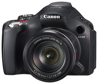 「PowerShot SX30 IS」は、焦点距離24-840mm相当(35mmフィルムカメラ換算)の光学35倍ズームレンズを搭載する超高倍率ズームモデル。高い倍率の望遠領域で発生しやすい色収差を補正する「Hi-UD(Hi-index UD)レンズ」や「UDレンズ」を採用している。撮像素子は有効約1410万画素のCCD、映像エンジンには「DIGIC 4」を搭載する。モニタは2.7型のバリアングル式液晶を備える。