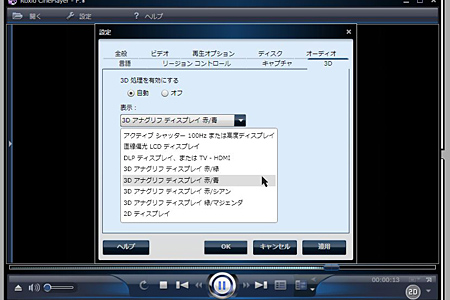 方法は簡単。「CinePlayer」を立ち上げてDVDをセットし、設定メニューから希望の3Dフォーマットを選ぶだけ。赤青メガネを持っていれば「3D アナグリフディスプレイ 赤/青」を選べばいいし、「3D アナグリフディスプレイ 赤/シアン」であれば、より効果の高い3Dが楽しめる。「nVIDIA 3D Vision」の環境が整っているなら、「アクティブシャッター 100Hzまたは変換ディスプレイ」を選べばいい。