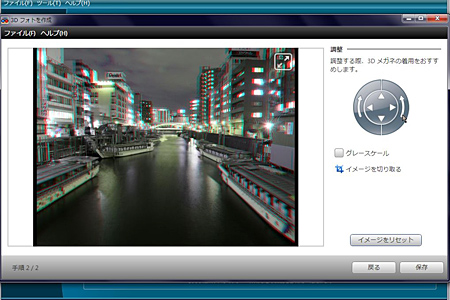 これだけで画像の3D化は完了。細かなオフセット量や傾きなどの調整を行うときは、右の「イメージ調整」ボタンを使う