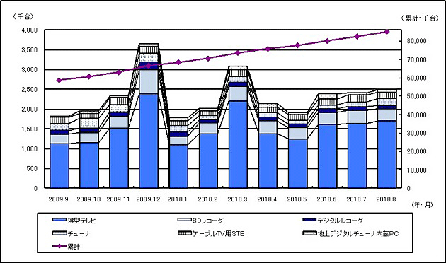 地上デジタル放送受信機器の8月の出荷実績は252万3000台。累計台数は8502万8000台となった。