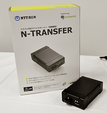 製品では、NTT西日本とNTT東日本(NTT東西)が、無線LANで端末とつなげば、PCなしでクラウドにデータを転送できるデバイス「N-TRANSFER」を発売する。データ送信先のクラウドとして、Evernoteを採用している。発売はNTT西日本のエリアが10月1日、NTT東日本が10月中旬の予定。価格は7350円。