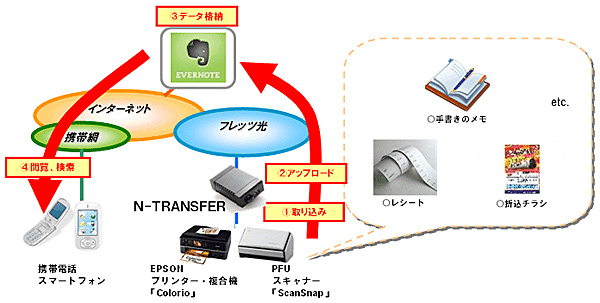 第1弾として、エプソン販売、PFU、クラウドサービスを提供する米エバーノートと連携。手書きメモやレシート、折込チラシなど、いろいろな紙媒体をエプソンのインクジェット複合機「Colorio」やPFUのカラーイメージスキャナ「ScanSnap」でスキャンし、PCを使わずに「フレッツ 光ネクスト」などのインターネット接続サービスを通じて、「Evernote」にアップロードすることができる。