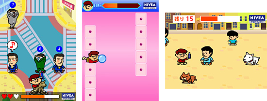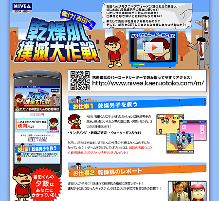 スペシャルサイトでは、今年4月にニベアフォーメンの宣伝マンに就任した、蛙男商会が制作するFlashアニメ『秘密結社 鷹の爪』の人気キャラクター「吉田くん」が登場する3種類の携帯電話向けオリジナルゲームを公開。ゲームを通じて、男性がスキンケアをすることの重要性や、ニベアフォーメンの特徴・機能などを紹介する。