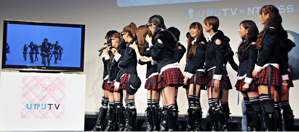 NTTぷららは、テレビ向け映像配信サービス「ひかりTV(ひかりディービー)」で、「AKB48 × ひかりTV」と題して、人気アイドルグループAKB48とタイアップ。劇場公演の様子やAKB48初の大型野外ライブイベントの3D映像などを、10月4日から提供する。10月4日の発表会には前田敦子さんや大島優子さんなどAKB48のメンバーが登場し、ファンにメッセージを送った。
